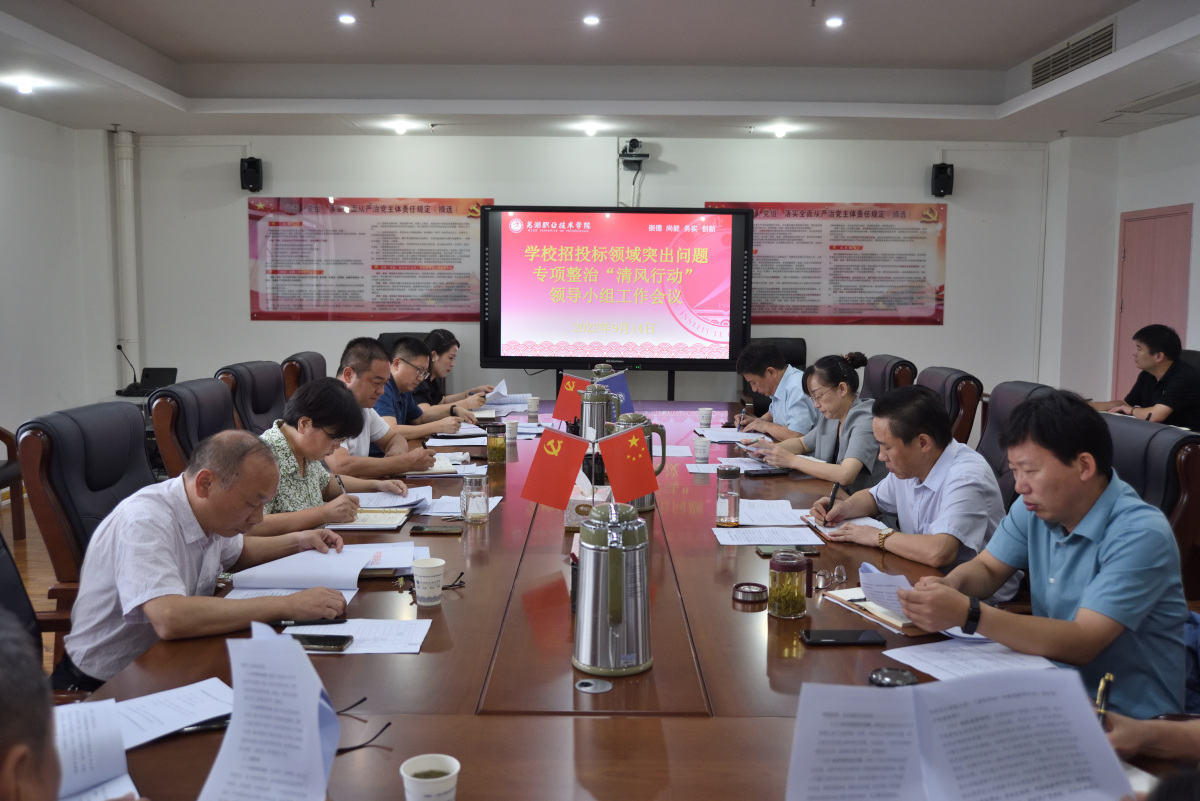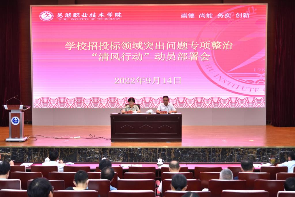 为贯彻落实芜湖市招投标领域突出问题专项整治“清风行动”有关文件和会议精神,认真落实学校党委会要求,9月14日,学校相继召开招投标领域突出问题专项整治“清风行动”领导小组工作会议和招投标领域突出问题专项整治“清风行动”动员部署会,部署安排学校专项整治工作。