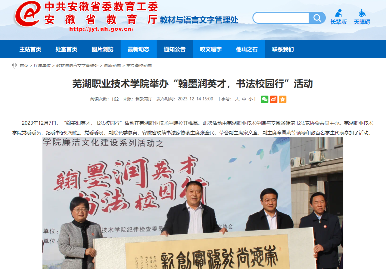 芜湖职业技术学院举办“翰墨润英才,书法校园行”活动